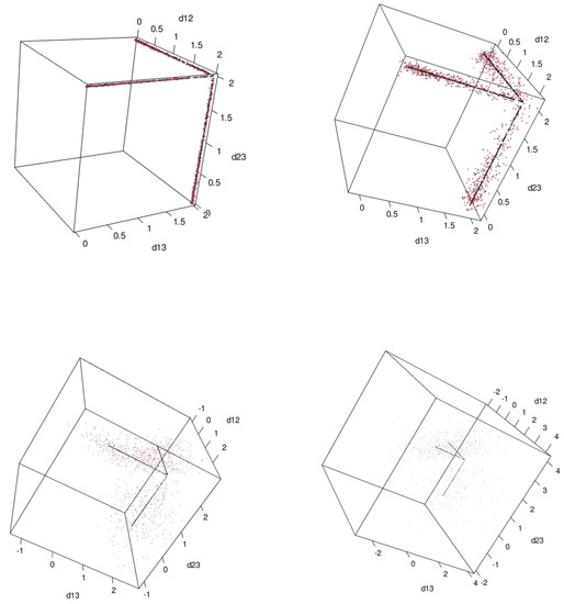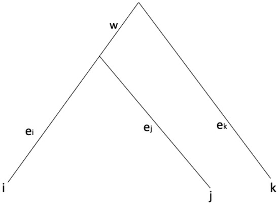 Example 1. Suppose we have a label set for leaves which represents a set of species at the present time. Suppose we have a rooted phylogenetic tree T shown in Figure 1. Internal nodes on T do not have labels. The internal node of the ancestor of leaves represents the most common ancestral species of species and the root of T is the most common ancestor of all species . Each branch length on a branch represents the mutation rate combined with its evolutionary time. A distance matrix computed from this tree shown in Figure 1 is a matrix such that , the th cell of the matrix d is the total branch length from a leaf to a leaf , that is, Since d is computed from a phylogenetic tree, d is a tree metric. Not all symmetric matrices with diagonal elements equal to 0 are not tree metrics. Through this paper, we assume that binary phylogenetic trees and the smallest branch length of an internal edge in a binary phylogenetic tree are strictly positive. In this paper, we focus on equidistant trees which are rooted phylogenetic trees with branch lengths such that the total branch length from its root to each leaf is the same.