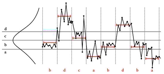 There are multiple works that describe the symbolization of time series. A general feature of symbolic dynamics analysis is that it assumes the existence of so-called generating partitions that divide the phase space of the time series trajectory into regions, such that each unique trajectory in phase space is associated with a unique sequence of symbols. Generating partitions can be constructed for certain models; however there is no general approach for constructing generating partitions from observations of an unknown system. Accordingly, in the model-free case, various data aggregations techniques are used to cluster nearby data points to induce such partitions. One such popular method, largely due to its simplicity and intuitive nature, is the so-called “threshold-crossing” technique. It operates by replacing real-valued data with symbolic indices based on the data values falling within a certain numeric interval. In extreme cases, a single threshold is used to create a binary representation with values above and below thresholds assigned 1’s and 0’s, respectively. An example of multi-threshold symbolization is the symbolic aggregate approximation (SAX) [1], shown in Figure 1.