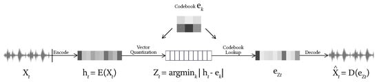 The input audio is segmented and encoded into latent vectors , which are then quantized to the closest codebook vector . The decoder then reconstructs the audio from a sequence of codebook vectors.