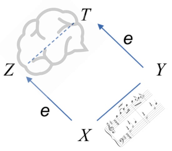 This relationship between the four factors X, Y, Z, and T is illustrated in Figure 4, schematically shown for an example of musical observations, with latent states schematically drawn near a brain-like icon. It should be noted that this representation is schematic only—there is no assurance that the latent representation follows similar dynamics to the data or that later on its symbolized version induces correct generating partitions. Nevertheless, we assume that finding a representation that maximizes the information dynamics of the resulting sequence is intuitively a good approach to discover meaningful structures present in the original data. We further assume that the following Markov relations exist between the variables: Z is assumed to be a hidden cause of X, which in turn causes Y, which is further encoded into T. In other words, the triplet obeys the following generative Markov relation , and similarly includes the probability for the next encoding.