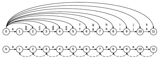 Two oracle structures with extreme values of . The letters near each forward links represent the assigned labels. (Top) The oracle structure with or extremely low. (Bottom) The oracle structure with a very high value. It is obvious that in both cases the oracles are not able to capture any structures of the time series.
