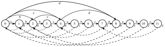 Suffix links are used to find the longest repeated suffix in X. In order to track the longest repeated suffix at each time index t, the length of the longest repeated suffix at each state t is denoted by and is computed by the algorithm described in Ref. [11]. The parameter is part of the on-line construction algorithm of the oracle automaton [11].