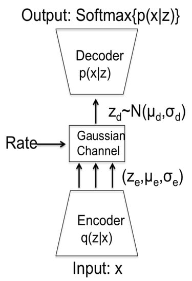 This process requires some explanation: for a given rate R we obtain the bit-rate for each of the latent variables according to the reverse water-filling procedure. This gives us different numbers of bits for each latent dimension, where the high-variance dimensions tend to grab the bits first, often leaving the weak (small-variance) latent variables with zero bits. Next, we proceed by sampling a value from the encoder distribution according to the original VAE mean and variance parameters, and . Then, using the rate R and the original mean and variance parameters for each latent variable, we derive a new mean and variance and . We use these probability parameters to sample a reduced-bit-rate value and use it as our new input to the decoder. One can see from Equation (18) that latent variables that are allocated zero bits need not be transmitted. More precisely, the value that the decoder needs is the mean value of that latent variable that is independent of the particular instance being transmitted. This mean value can be obtained a priori and thus can be “hard coded” into the decoder ahead of time, with no need to transmit it. Channels allocated a very high rate will transmit an (almost) unaltered value of the latent variable that was sampled in the VAE encoder.