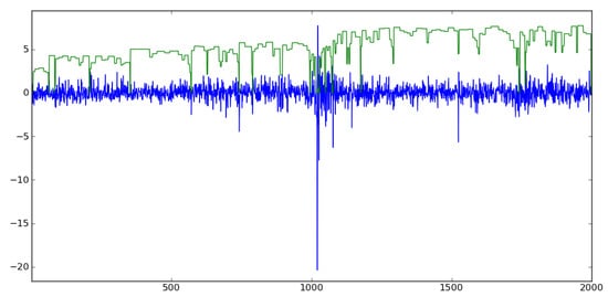The intuition behind information dynamics can be seen by examining how IR corresponds to volatility in a financial time series. In Figure 8, the volatility in stock prices is shown together with an instantaneous information rate plot. The data are taken from the daily returns of the S&P500 stock index from 1 October 1983 to 30 August 1991. The volatility of the series was estimated by taking the root of the five-day average of squared returns, as described in Ref. [21]. One should note that the application of information rate analysis is performed here on a short time basis, depending on the length of the repeated suffix at each data point in time.