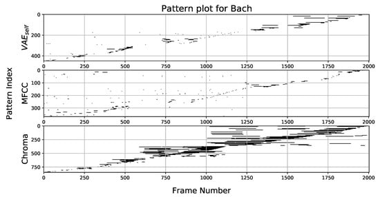 In Ref. [7], the VMO algorithm was used to discover patterns in audio recording using a special feature called a chromagram that aggregates the signal energy from different frequencies into 12 bins that correspond to 12 basic musical pitches (pitch classes). The chromagrams were specially processed so as to match the beat structure of the music. To consider transposition, the distance function used in the VMO is replaced by a cost function with transposition invariance. The algorithm for pattern discovery is presented in Ref. [7]. The only parameter it requires is a minimum pattern length. The VMO performance was SOTA compared with other existing methods as tested on a musical benchmark that was produced by human experts as the ground truth for motif analysis. Further uses of this method allowed us to construct motif-grams (plots of repeated motifs that occur in music over the time course of the musical piece). An example of a motif-gram for a recording of a Bach musical piece is shown in Figure 9.