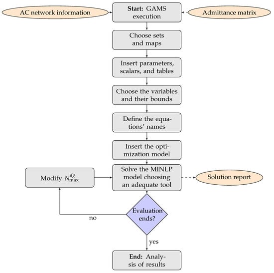 The remainder of this paper is organized as follows: Section 2 presents the general MINLP formulation for the studied problem. Section 3 illustrates the main aspects of the solution methodology based on GAMS software and the recursive validations using power flow solutions in MATLAB and DigSILENT programming environments. Section 4 outlines the primary characteristics of the IEEE 33- and IEEE 69-bus systems. Section 5 presents the main numerical results with their corresponding analysis and discussion. Lastly, Section 6 lists the main concluding remarks derived from this research and some suggestions for potential future research.