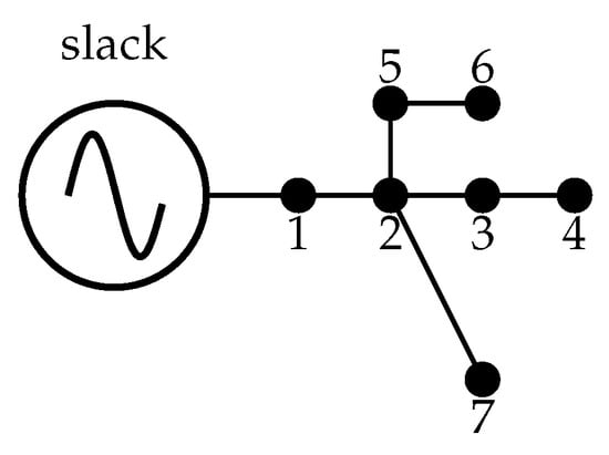 where denotes the vector containing all the complex voltages in demand nodes, corresponds to a sub-matrix that relates demand nodes among them, indicates the vector containing all the complex power generation in dispersed generators, represents the vector that contains all the complex power demands, corresponds to a rectangular sub-matrix that relates the demand and the slack nodes, and corresponds to the vector that contains all the voltages in the slack node. Note that t is the iterative counter, implying that, for , the initial voltage vector is assigned as [44].
