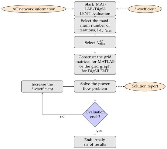 To validate the solution provided by GAMS software, the validation stage of the proposed solution methodology was implemented using the power flow method (successive approximation power flow method [33]) in the MATLAB programming environment, which was evaluated recursively until the convergence failed. An identical approach was adopted in DigSILENT software using the Newton–Raphson power flow method. The general flow diagram for the numerical validation in MATLAB and DigSILENT is depicted in Figure 3.