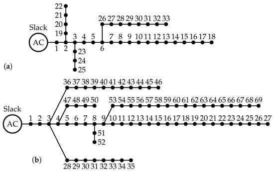 Two test feeders were employed to validate the proposed solution methodology for enhancing the voltage stability margin in AC distribution networks by considering the optimal placement and sizing of dispersed generators. The test feeders correspond to the IEEE 33-bus system and the IEEE 69-bus system, both with a radial structure and operated at the substation bus with 12.66 kV of nominal voltage output. The electrical configuration of both the test feeders is depicted in Figure 4.