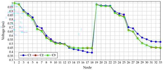 The voltage profiles shown in Figure 5 indicate that the minimum voltage profile in C1 was caused at node 18 with a magnitude of 0.3905 pu, which directly relates to the numerical results in Table 4. Accordingly, in all the simulation cases, node 18 was selected as the optimal location for the dispersed generators, particularly since the unique increase in the voltage profile at this node reduces the total power consumption through the injection of active power locally.