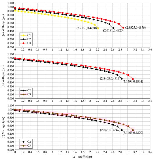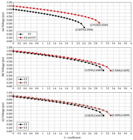 From the results in Figure 6, we can note that (i) the worst voltage profile occurs in C1, when the grid does not have the penetration of dispersed generation, with a magnitude of 0.3904 pu when the loadability index assumes a value of 2.4079 (Figure 6a); however, when one dispersed generator was installed in C2 and C3, the voltage profile increased to 0.5240 pu with the -coefficient increasing to 2.9128, which is an improvement of approximately with respect to the benchmark case; (ii) when two dispersed generators were installed for C2 and C3, it was observed that the -coefficient values became 3.0590 and 3.30968, respectively, which correspond to improvements of approximately and with respect to the same scenarios with one dispersed generator; however, the voltage collapse point does not present high variations; it was approximately 0.4489 pu and 0.4435 pu in C2 and C3, respectively; and (iii) when three dispersed generators were installed, the increments of the -coefficient were approximately % and , respectively. It can be concluded from these values that the limitation imposed by the -coefficient saturates the total improvement of the loadability index when the possibility of installing dispersed generators increases. However, the numerical results in the IEEE 33-bus system exhibited the effectiveness of using dispersed generation to enhance the grid voltage stability index.