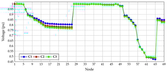 Behavior of the voltage profiles in the benchmark case, i.e., C1, and simulation cases C2 and C3 with three dispersed generators for the IEEE 69-bus system.