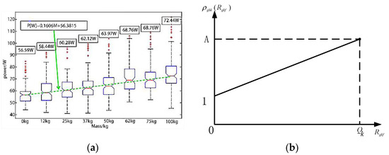 As shown on the left of Figure 3, Hector Montes and Lisbeth Mena found that the power consumption of the robot is significantly affected by the load weight, which means that its transportation time is related to the load weight [43]. On this basis, we developed a function where load weight affects running time, as shown in the right side of Figure 3 and the Equation (1). Where the transport influence coefficient is positively correlated with the load, represents the maximum load of the robot; A is the upper limit of the load weight; and A ≥ 1:
