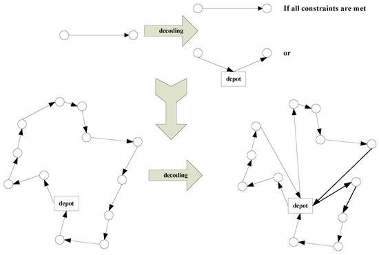 The method used in this paper is the set-based particle swarm optimization (S-PSO), which is a discrete particle swarm optimization algorithm designed specifically for solving the MDVRPTW. represents the position of the particle, and represents the velocity is represented by . If the number of particles in the swarm is N, represents each particle in the swarm,. represents the current number of iterations. The position of the particle in VRPTW is expressed as , and the position of each particle in the m-dimension is expressed as . Therefore, the position of the particles can be expressed as Equation (20). The position of each particle represents a directed Hamilton circle in the complete graph, and the Hamilton circle can be converted into a specific solution for a set of vehicle routes using the constraint-based decoder in this paper. As shown in Figure 4, starting from the outer arc of the warehouse, if an arc in the Hamilton circle satisfies all the constraints in the model, it will be retained; otherwise, the warehouse will be inserted between two nodes and the arc replaced by two new arcs. Through the definition of particle position and a constraint-based decoder, each particle represents a feasible solution to the model of the collaborative and persistent delivery problem of SR in the algorithm.