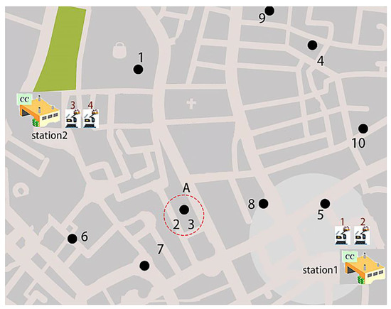 The system layout of the smart community is shown in Figure 5. We supposed that there are two service stations, located at (104, 32), (16, 69). Service station 1 has two robots, 1 and 2, and service station 2 has two robots, 3 and 4. The loadable capacity of these robots is 3, and their maximum distance is 300. Table 1 describes the 10 task requests in the delivery service area, and in this table, the serial number of the first column represents service customers. The second and third columns represent the X and Y coordinates of the service customers. The fourth column and the fifth column, respectively, represent the service time window required by the customer; the sixth column represents the time required for service at the customer point. For example, task 1 is located at coordinates (31, 82); it should start between time 0 and 2, and the execution of this task requires 0.5 s of service time. The charging time of the service station is supplemented according to the power loss of the robot during transportation. Since the simplified model considers that each robot is only transported once, it will return to the originating station to recharge or load the product after completing the task. As always, the robot has strict restrictions on the products that can be loaded. However, it is possible that a certain task is too heavy, so we divided this task into two tasks sharing the same location and time constraint, such as task A in the table. In our follow-up algorithm application, the distance between the two tasks is calculated according to the position of each task on the map. The specific calculation is shown in the following formula: