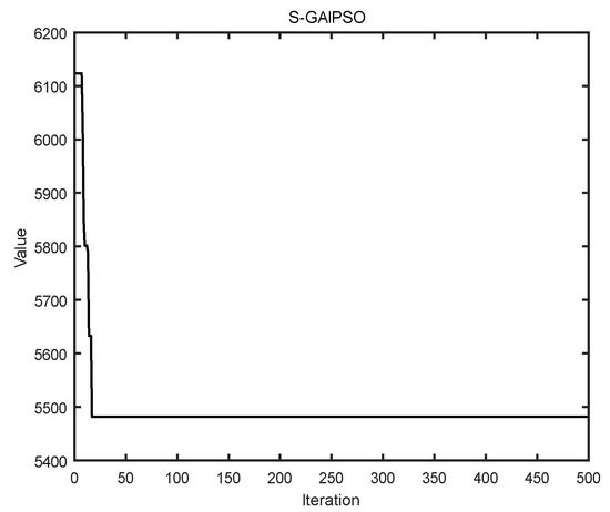 Using the proposed algorithm, we obtained the best solution where the objective function value is 5496.2. As shown in Figure 6, it is the final assignment route of the 10 tasks. The optimal value iteration curve obtained by the algorithm is shown in Figure 7, and the specific task plan is shown in Table 2. Robot 1 leaves station 1 and returns to station 1 after performing tasks 2, 8, and 5. Robot 2 leaves station 1, performs tasks 10, 4, and 9, and then returns to station 1. Robot 3 leaves stations 2 and returns to station 2 after performing task 3, task 7, task 6, and task 1. It can be seen robot 4 is not used. Task A is finished by the robot 1 and 3 together.