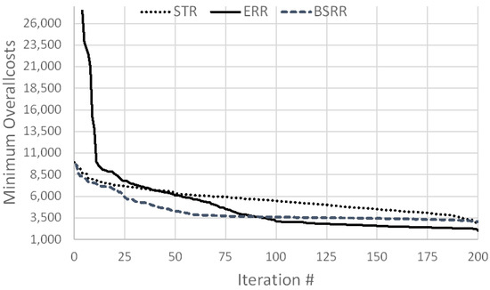 In order to investigate the performance of the proposed simheuristic versions, a simulation study was performed. The target was to identify the impact of SBM and SA on the minimum overall cost that can be achieved. Each simheuristic version (STR, ERR, and BSBR) was evaluated using 100, 200 and 300 iterations, while each combination of SBM and SA was tested. The 36 possible experiment combinations and their associated minimum overall costs are shown in Table 4. Each result represents a unique and not completely reproducible simulation experiment. Each experiment was performed four times to get comparable results and to lower the impact of outliers. For example, from Table 4, the experiment {STR with SBM = NO, SA = YES, Iterations = 100} was run four times to get the value of 3159 cost units (CU). This value represents the average minimum overall cost of this four experiments. The result of the previous experiment used the simulation budget of 2000 runs. In detail, for 100 iterations the simulation budget is 2000 runs, for 200 iterations the budget is 4000 runs, etc. In total, 768,000 runs were performed to get the results described below.