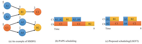 Scheduling methods for SDFG on multi-core systems are classified into static scheduling [23,24] and self-time scheduling [25,26,27,28,29]. The self-time scheduling method studies SDFG, which completes scheduling based on actor readiness and completion times, and is a scheduling strategy with many real-time requirements. Ref. [25] proposes an offline heuristic strategy for speeding up algorithm scheduling rather than optimizing scheduling quality. Ref. [26] is oriented towards a specific DSP multiprocessor architecture. Scheduling with other real-time tasks interfering is considered in [27], where the scheduling algorithm proposed in [27] relies on special cases. Ref. [28] considers multi-mode multi-processor scheduling techniques that can schedule all SDFGs in all modes simultaneously. Ref. [29] is targeted at specific embedded stream processing applications using a symbolic approach for SDFG analysis. DAG-based scheduling is a type of static scheduling method. PAPS [3] and DONF [4] are methods for scheduling SDFG on a multi-core systems based on the DAG model. The PAPS method uses a Hu-level [7] based approach in the task-selection phase to calculate the level values of individual vertices. Priority is given to the vertex with the larger level value for scheduling. However, no core selection policy is specified with PAPS. The DONF method only calculates the priority of tasks that are locally in the ready state during the task-selection phase. The DONF method ignores the global information of the computed graph and also specifies the handling strategy when tasks of equal priority conflict with the number of processors. The DONF method studies single DAG, whereas HSDFG is transformed from SDFG and multiple DAG will exist.