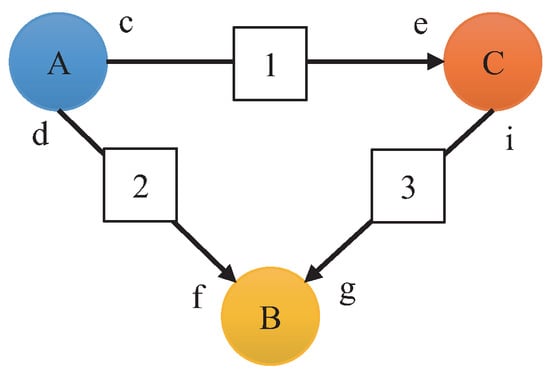 We represent an SDFG using the tuple , where denotes the set containing n actors, denotes actor i, denotes the set containing k directed edges, and denotes the i-th directed edge. Use to denote the production rate of directed edge arc-tailed actors and to denote the consumption rate of directed edge arc-headed actors. The SDFG is represented using a topological matrix similar to the correlation matrix [3], where the rows represent directed edges and the columns represent actors, generating a matrix with k directed edges and n actors. The topological matrix element is given the value rule as in Equation (2).
