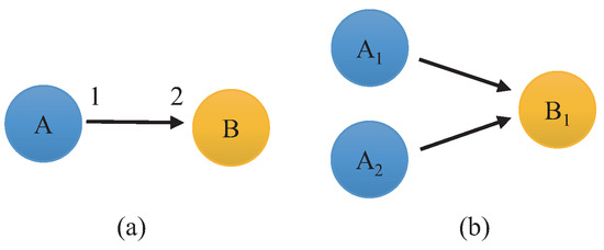There are two actors A and B, and an SDFG consisting of a directed edge, as shown in Figure 3a. The production rate of port A is , and the consumption rate of port B is . According to the balancing Equation (1), at the minimum period, A needs to execute 2 times to satisfy the data demand of B. A needs to create 2 instances ( and ) and B needs to create only 1 instance () to construct the HSDFG as shown in Figure 4b.