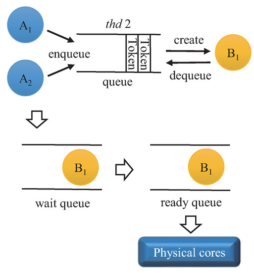 An overview of the SDAG model is shown in Figure 5, where instance is created using a data-driven mechanism and then is added to the waiting queue. If is dependent on many FIFO queues, then the input port state of is updated whenever a FIFO queue satisfies Equation (9). When all input port states of are available, is added to the ready queue. All instances in the ready queue can be dispatched directly to the physical core for execution.