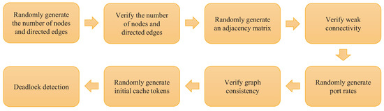 The main modules of our designed SDFG random generator are given in Figure 6, along with the relationships between the modules. The number of randomly generated nodes and directed edges obey a uniform distribution, and only the maximum values of the number of nodes and directed edges need to be set at the APIs. The number of nodes and directed edges are checked to ensure that both satisfy the boundedness of the directed graph. The key function implemented by the randomly generated directed graph module is to randomly construct the adjacency matrix and then do a connectivity test on it. Randomly generated port rates are used to make the SDFG satisfy the consistency requirement; randomly generated initial caches are used to resolve the deadlock situation where the SDFG has a directed loop. The parameters of the SDFG random generator that we use in this evaluation are shown in Table 2.