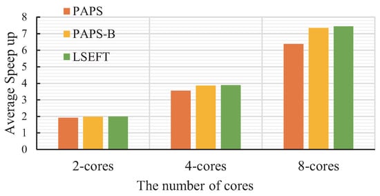 Without loss of generality, we used the SDFG random generator, configured as shown in Table 2, to generate 958 SDFGs. The same conversion algorithm in the [3] is used to convert to 958 HSDFGs. We processed 958 HSDFGs using the PAPS, PAPS-B and LSEFT algorithms, respectively. The PAPS, PAPS-B and LSEFT algorithms calculate the speedup using Equation (20) after each HSDFG is processed and save the speedup. When all the test case data were processed, the speedup for each test case were also calculated and stored. Finally, the average of these speedups was calculated; the results are shown in Figure 7. In Figure 7, we take the average of 958 speedups as the measurement data. The performance ranking of the algorithm based on the average speedup is LSEFT, PAPS-B, PAPS. For the generated SDFG, LSEFT outperforms the rest of the algorithms. Moreover, the average speedup of the LSEFT algorithm performs well for the 8-core simulation, with an average speedup improvement of 10.17% compared to the PAPS algorithm. Furthermore, Figure 7 shows that the EFTstrategy is superior to the load balancing strategy.