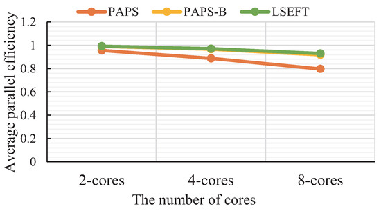 For a homogeneous processor system, the execution performance of each processor core is the same. For a given number of HSDFGs and processor cores, the denominator of Equation (21) is constant, so the smaller the makespan, the larger the speed up , and the higher the parallel efficiency, corresponding to the better the scheduling algorithm. We also tested the average parallelism efficiency using 958 HSDFGs for each scheduling algorithm. The performance ranking of the algorithms based on average parallel efficiency is LSEFT, PAPS-B, PAPS. The results are shown in Figure 8, where the parallel efficiency of the PAPS algorithm decreases as the number of processor cores increases. Although the parallel efficiency of the LSEFT algorithm also decreases, the decrease in LSEFT is significantly lower than that of the PAPS algorithm. In terms of the decreasing trend, the PAPS algorithm has a steeper decreasing trend, implying that the parallel efficiency of the PAPS algorithm will decrease more when the number of processor cores increases. Therefore, the results in Figure 8 also clearly show that the LSEFT algorithm has a higher and more stable parallel efficiency.