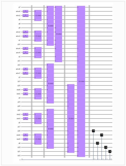 The circuit for simulating the quantum voting process in a parliament of 14 legislators, where Alice and Bob’s parties have 8 and 6 representatives respectively.