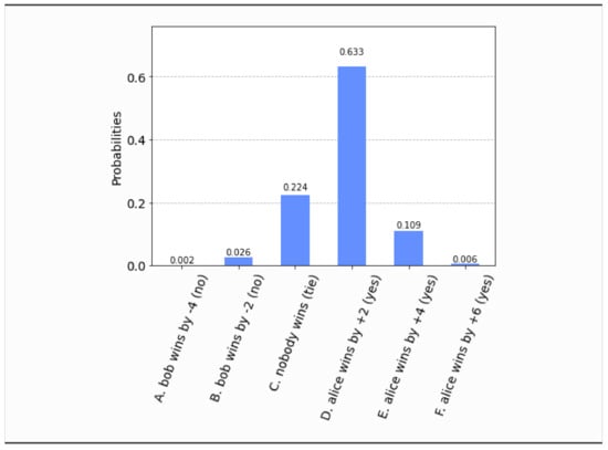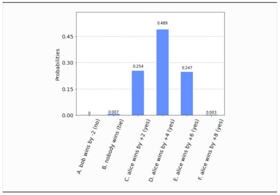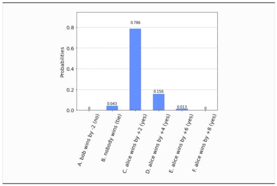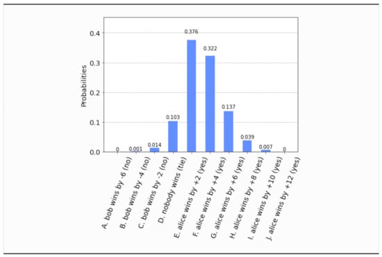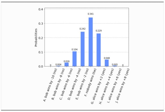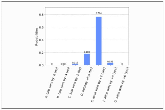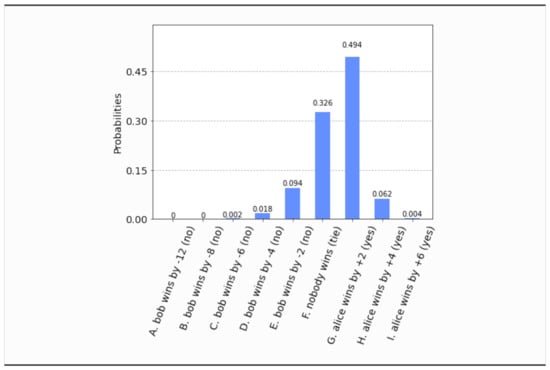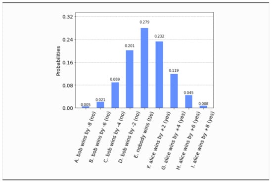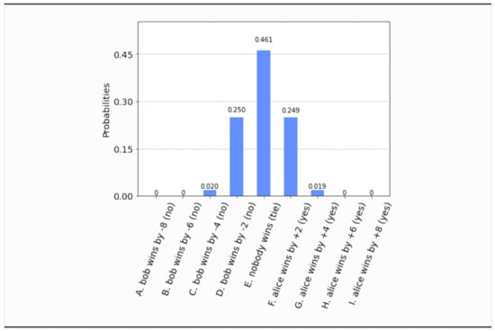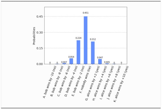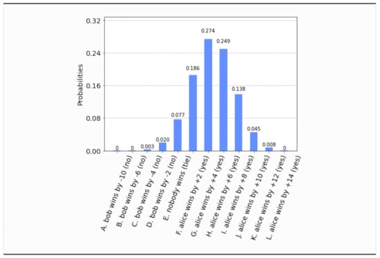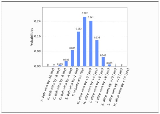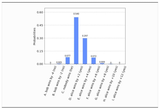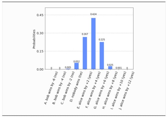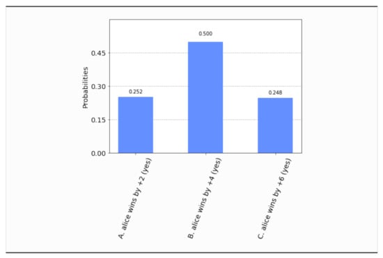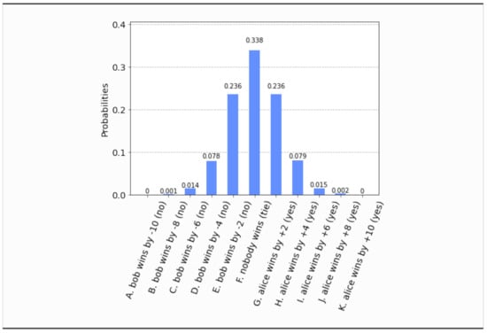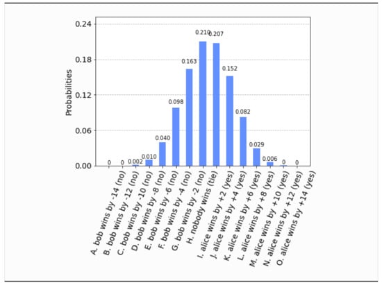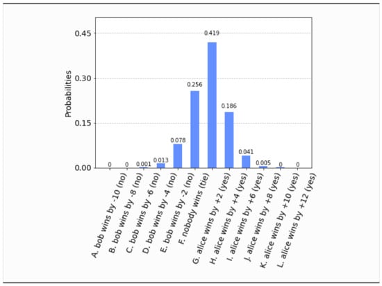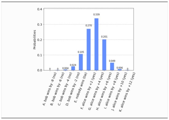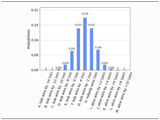 - This time, even if both parties set their free will radii to zero, , the parliament does not become completely classical, in the sense that the voting outcome is no longer unique. It is still predetermined that the bill will pass, i.e., , but what is not certain a priori is how many representatives will vote in favor of the bill. The probability distribution of the outcomes is shown in Figure 17. Now the most probable outcome is that the bill will pass with a margin of 4 votes instead of 2. Hence, the presence of independent legislators in the event of zero free will radii, will simply result to a wider margin of surplus votes for the bill. Let us remark that this situation is experimentally distinguishable from the analogous situation in Section 4.1, as can be seen by a direct comparison of Figure 17 with Figure 3.