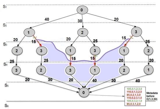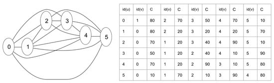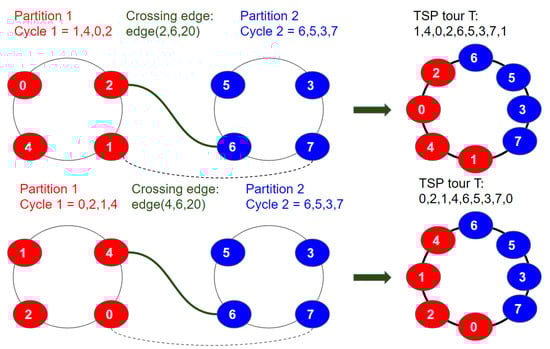 - Edge attribute partitioning (EP-TSP): In this method, the graph is partitioned in such a way that the total weight of edges across the partitions will be minimum. The intuition behind this method is to minimize the cost of connecting the sub-tours when the number of partitions is higher. For example, in Figure 5, the total weight of edges across the partition is 320. Therefore, this method can save computation cost for graphs with a higher number of partitions because if the weight across the partition is already minimized, then the probability of getting a nearly optimal tour increases. This partitioning strategy avoids a higher cost edge in the partition.
