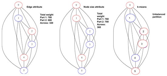 - Vertex size attribute partitioning (NP-TSP): The vertex size is defined as the total weight of outgoing edges from a vertex. This method focuses on balancing the partitions. The vertices in a partition are added in such a way that the difference between the total weight of each partition is minimum. For example, in Figure 5, the total difference between both the partitions is less than the edge attribute method. This is the baseline partitioning method without any constraint.