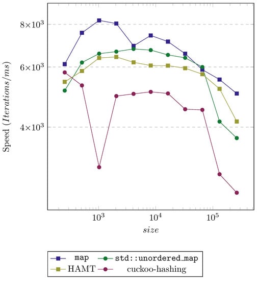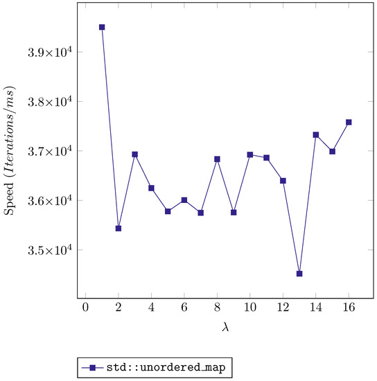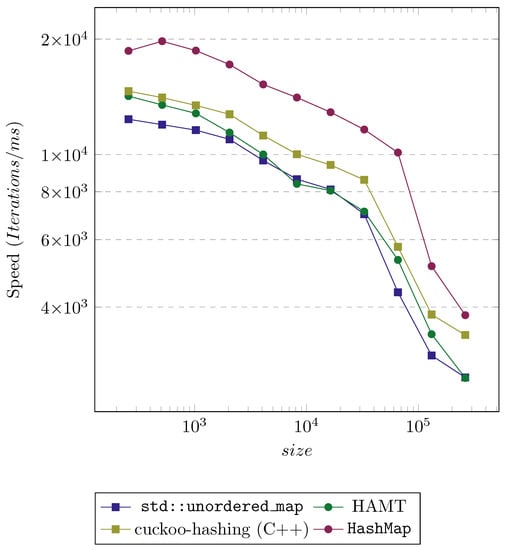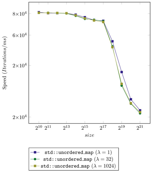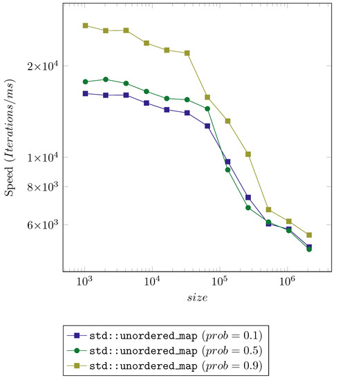 However, displaying the same graphic with std::unordered_map yields surprising results. Figure 5 shows a sharp decline in the standard C++ hash table starting at and well, that is not expected because theoretically the speed should be almost constant, that is, it should keep its value about iterations/ms as it does until that limit. On a first thought, the number of collisions could be blamed for this strange effect, so it was decided to get another reference of complexity and that is the reason for the array adapter. Since in this case the keys are consecutive integers, they could be used directly as indexes in an array, and due to the flexibility of C++ templates, it is possible to program such a not-so-practical data structure without any problem.
