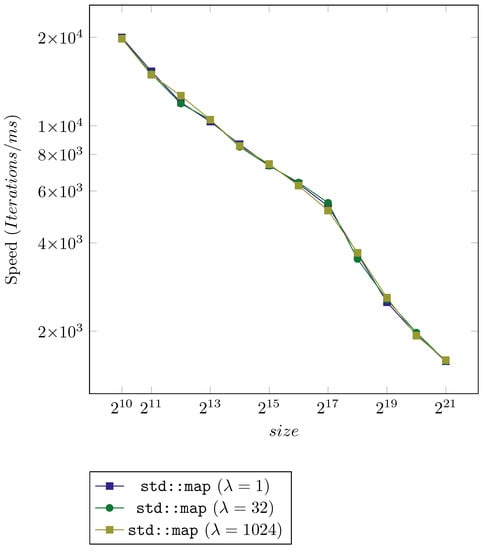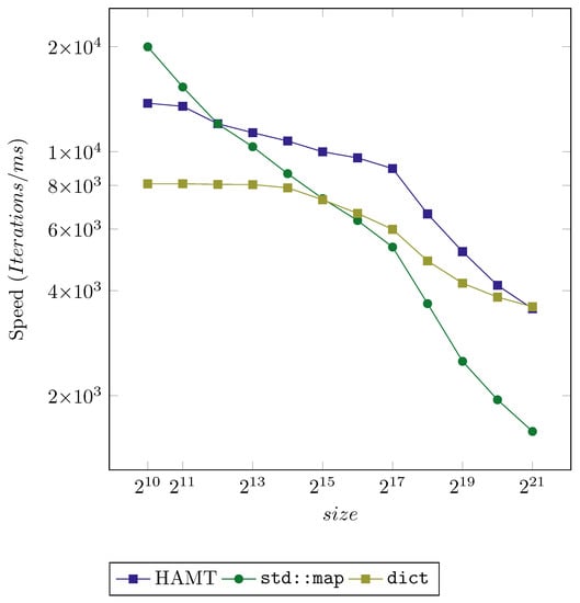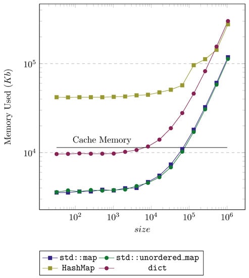 On the other hand, with this results, someone may argue that the predictions are accurate at low sizes, but they are not. Along benchmarks, the C++ std::map, being a tree, has been used as a performance reference, the complexity of its operations are reported as being instead of , so that is the reason of being slower. Well, definitely that does not have consistency. At low sizes, we can say at , the value of is so low that it can hardly explain any difference in computing time. Therefore, again, the cause of the speed difference should be looked for in another place. Most probably, the different use of L1 and L2 cache memory, due to data locality, could be blamed for that, but finding sucha cause could be the objective of another work.