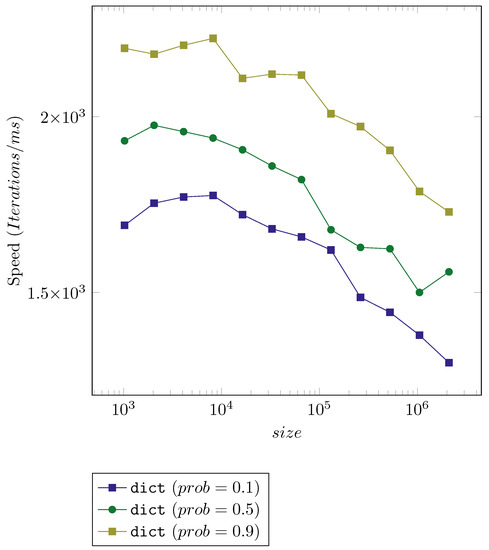 The tendencies in this case are not very similar, some alternatives like C++ std::map does not show a lot of differences, but hash table-based solutions tend to show a slight decrease in speed when the insertion/removals are involved. For instance, the std::unordered_map curves are shown in Figure 9. Since the lowest speed is at , that means insertions and removals are slightly slower than lookup operations. The results in Java are similar, but in Python (Figure 10) it is possible to observe a clear gap between the curves with and , indicating that the difference between them is more important.