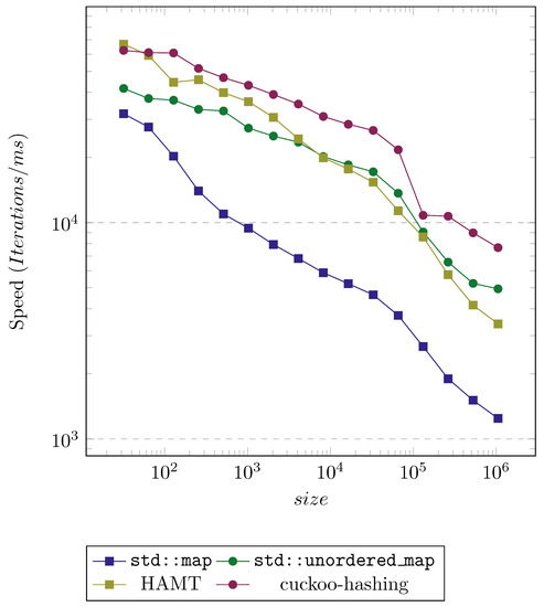 Anew, the expected result should be constant speed against the size. But Figure 6 shows once again unexpected results. Nearly at the same value, , the speed is reduced dramatically, almost by one magnitude and there are no collisions in this data structure, only an array. We will discuss it later, but the fact is that in every data structure or programming language the performance degrades when some limits are reached.