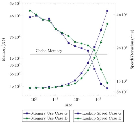 Cases D and G are very similar, both use string keys, both have random float numbers as values, and both of them compute the sum of the values. The difference is the size in both keys and values. In case G, keys are twice the length of keys in case D and case G values are 8 numbers instead of just one. Figure 14 displays both speed and memory use for C++ std::unordered_map in cases D and G. Black line is the total of the cache memory according to the computer specifications. There are two interesting points in this graphic: