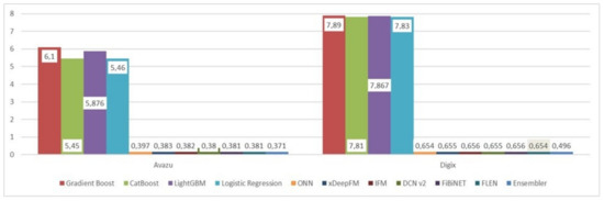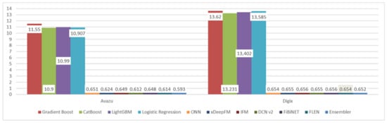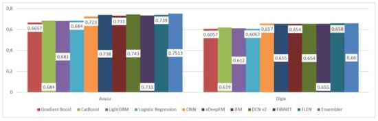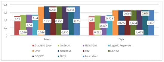 Regarding the second dataset, the DIGIX, 1 M were randomly selected and the sample contained nearly 78% ‘No’ and 22% ‘Yes’ regarding the dependent variable (so as to be equivalent with the first sample). Once again, 80% used for training and 20% for testing. Additionally, the same tuning was followed. Table 1 and Figure 1 and Figure 2 below display the results in these two datasets. It can be noticed that state-of-the-art deep learning models clearly outperform traditional models, providing very satisfactory results. There are not any significant differences among them (DCNv2, FLEN, and FiBINet have slightly better results). It is also worth mentioning that the ensembler improved the results.
