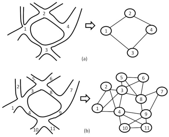 The two graph models are explained using two different examples. (a) The primal graph model, which consists of representing the intersections by nodes and the roads by edges. (b) The dual graph model, which consists of considering the roads as the graph nodes and the crossing point between them as edges.