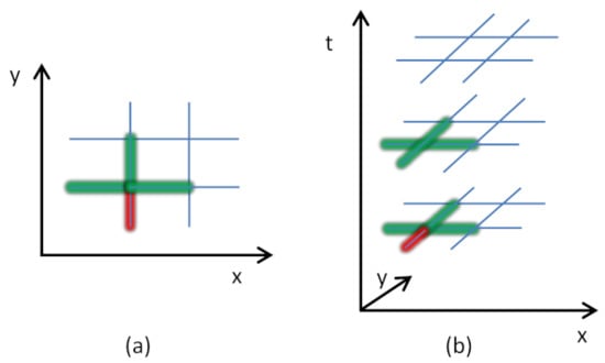 For each of the links, we iteratively build a snake, which is a sequence of links, with the objective of having a minimum variance of all the chosen link speeds at each step. One can consider this as a snake that starts from a link and grows by attracting the most similar adjacent link iteratively (Figure 3). Figure 3 shows an example of a snake, initialized by a link in red. The green links represent the neighborhood, according to two- and three-dimensional approaches.