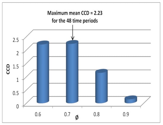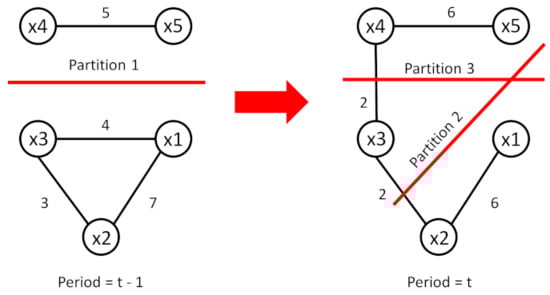 In the context of spectral clustering, we consider two partitions, and , which are the results of clustering the transport network at a time period t. We assume that the two partitions give similar performance at time period t, but in the case of clustering historic data, the clustering performance using partition is preferred because it is more consistent with historic data. In this case, the evolutionary normalized cut’s total cost can be expressed as follows [18]: