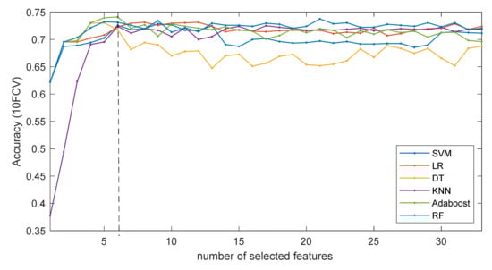 Figure 1 shows the classification accuracy (10FCV) of the six competing ML models with respect to the number features, as they have been ranked by the proposed FS algorithm. An increase on the classification performance of all ML algorithms was observed for the first 6 selected features, whereas the inclusion of additional features had no significant effect on the classification accuracies. The overall best 10FCV accuracy was obtained by Adaboost at the first six selected features (0.7466). In light of these results, the first six selected features were finally kept for the subsequent analysis.