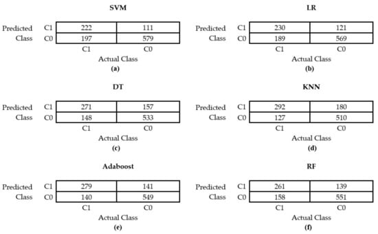 Confusion matrixes of the six competing ML models: (a) SVM, (b) LR, (c) DT, (d) KNN, (e) Adaboost and (f) RF.