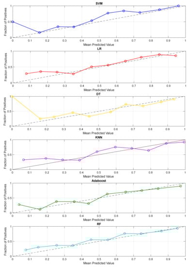 Figure 4 shows reliability graphs for each of the six competing ML models that compare how well the predicted outputs of the binary classifiers are calibrated. The average predicted probabilities for binned predictions are shown in the X axis, whereas Y axis denotes the proportion of samples whose class is positive per bin. Being a measure of uncertainty, the reliability graphs of Figure 4 demonstrate how closely the predicted class probability reflects its ground truth likelihood. The two ensemble algorithms (Adaboost and RF) were proved to be the most reliable ones achieving the lowest observed mean average errors (MAE of 0.0797 and 0.0692, respectively) from the ideal calibration condition (shown with the dashed black line). LR accomplished a moderate MAE of 0.0857, whereas the rest of models achieved MAEs higher than 0.1.
