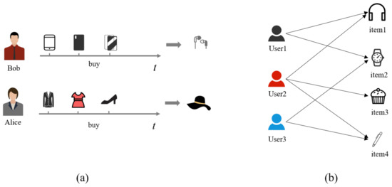 In the era of big data, the large volume of online information generated in real time makes it very difficult for people to quickly find the valuable information they need. The recommendation algorithm is effective to solve the current information overload problem by recommending useful information to users while filtering out the less relevant information [2,3]. For example, in some online multimedia websites, user experience can be greatly improved by recommending the movies or songs to them which they may be interested in [4]. In many e-commerce platforms, recommending products that users would like to buy can help save their time and money [5]. Thus, accurately predicting the interactions between users and items is critically important to recommendation [6,7,8]. Figure 1a shows an example of the sequential interactions between two users (Bob and Alice) and the items. One can see that Bob first buys a cell phone, and shortly he buys a phone case and a phone film. Thus, we can infer that he is more likely to buy a mobile earphone rather than a suit. Figure 1b shows an example of user–item interaction on an e-commerce platform. Each arrow represents an interaction from a user to an item, e.g., a user buying or browsing a commodity on e-commerce platform Taobao, with each interaction associated with a timestamp t and a feature vector f (such as the interaction types, users and commodity features). An interaction between a user and an item can be a user clicking, buying, or browsing a certain commodity on the online shopping website.