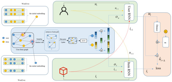 To address the above issues, in this paper we propose a Meta-path guided Recursive RNN based Shift embedding method named MRRNN-S to more effectively learn the dynamic representations of users and items, based on which the future user–item interactions can be more accurately predicted. Inspired by the previous work [1], we argue that the previously proposed RRNN-S model can still be further improved in terms of processing the original data. RRNN-S only utilized the second-order graph structural information but ignored the fact that the sequence data and the heterogeneity hidden in the graph can also provide auxiliary information. Therefore, we propose to add two new modules, namely the word2vec module and the skip-gram based meta-path module to the RRNN-S model. The word2vec module treats the sequential interaction data as sentences and then extracts the semantic information of the sentences by using the word2vec method. The ship-gram-based meta-path module models the user–item interaction data as a heterogeneous graph to more effectively capture the heterogeneous information, and then learns the node embeddings on the graph. MRRNN-S first uses a word2vec module to capture the features from the user–item interaction sequence. A skip-gram-based meta-path module is proposed to capture the heterogeneous information and higher-order proximity from the user–item interaction graph. Next, a recursive RNN module is also designed to catch the sequential dependence of user–item interactions simultaneously by mapping users and items into the same latent representation space. The embeddings of users and items are mutually and iteratively updated by the proposed recursive RNN. Then, a shift embedding module is designed to predict the continuous future embedding of a user through the time interval and then predict the user embedding. Finally, we predict the embedding of the item and identities the item whose embedding vector is closest to it in the embedding space.