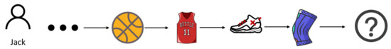 Features extraction from the interaction sequence. We can regard the interaction sequence of one user as a sentence and then learn the sequential information from it. As shown in the white box of Figure 2, each item interacted by the user in the sequence can be regarded as a word in a sentence. Thus, we can project the representations of items and users to a common latent space by word2vec. For example, as illustrated in Figure 3, this is an interaction sequence of user Jack with items. He first buys a basketball, and shortly he buys a basketball jersey, sneakers, and knee pads. Obviously, these four items share some common features because they all belong to the category of sporting goods. Thus it is meaningful to make them close to each other in the projected latent feature space.