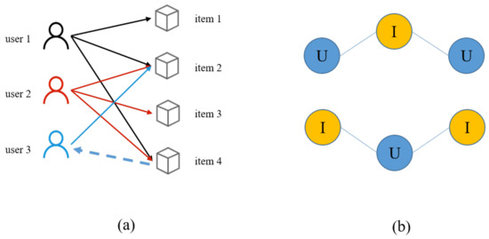 Features extraction from graphs. The user–item interaction data can be also treated as a graph. As shown in the blue box in Figure 2, the user–item interaction graph consists of users’ historical interaction data. There are two types of nodes including users and items. A solid line connects one user node and one item node if the user interacts with the item. As depicted in Figure 4, one can see interacts with , , and while interacts with , , and in this user–item interaction graph. It is reasonable to infer that and are more similar because both of them are interacted by users at the same time. When interacts with , it is appropriate to recommend to . Thus, the user–item interaction graph is able to preserve rich auxiliary information. In addition, in order to make use of the heterogeneity, inspired by [44], we define the metapath which is able to reflect the semantic information between nodes in the graph. For example, given the metapath U-I-U, (U-I) means a user interacts with an item, and (I-U) means the item is interacted by another user. We can sample some instances of the predefined metapaths in the graph by random walk, and embed each node with a skip-gram model to capture the heterogeneity and structure information from the graph.