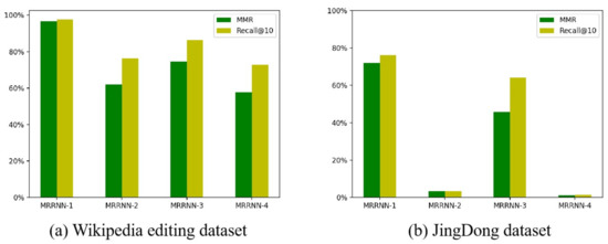 In order to show the influence of each module on MRRNN-S more intuitively, we draw a histogram of the percentage of each variant’s performance to the performance of the full model over the two datasets presented in Figure 6. Through Figure 6, one can clearly observe that the sequential information hidden in the interaction sequence seems to be more important on both two datasets because ignoring such information will result in a remarkable performance decline in terms of MRR and Recall@10. One of the possible reasons is that the data sets are mainly composed of sequence data, while the graph data structure is relatively simple. In particular, there are only two types of nodes that can be utilized. In addition, one can also observe that the performance of MRRNN-2 on the two datasets is quite different, with the performance on the Wikipedia dataset significantly better than the performance on the JingDong dataset. This is probably because of the contradiction between the large amount of data and too few types of nodes in the JingDong dataset, which makes the model more difficult to acquire useful auxiliary information from the sparse heterogeneity. Overall, MRRNN-S achieves the best performance in both Wikipedia and JingDong datasets when the three modules are combined, which verifies that the four proposed modules are all helpful for improving the model performance.