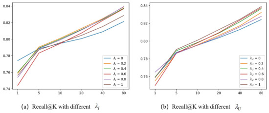 (a) Recall@K with different when . (b) Recall@K with different when .